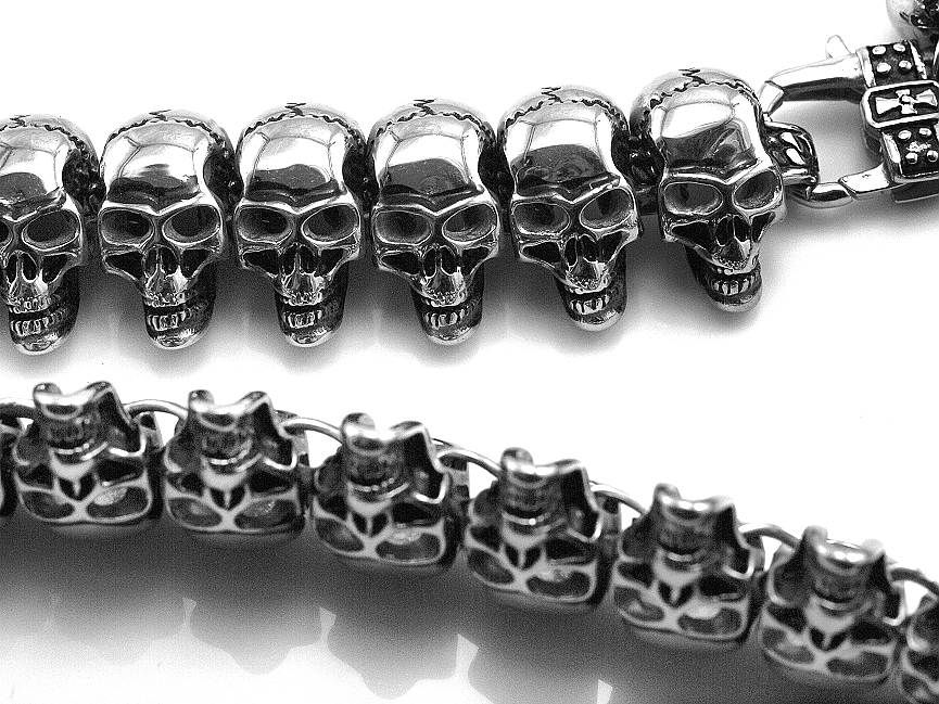 Velice výrazný a originální řetěz pro muže.Chirurgická ocel 316 L. Těžký masivní šperk. Leštěný povrch s patinovanými aplikacemi. Lebky jsou odlehčeny jako výlisek. Zapínání na masivní karabinu.